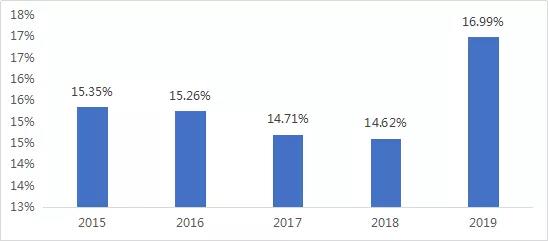2015-2019年我國(guó)城市平均供水管網(wǎng)漏損率(單位:%)