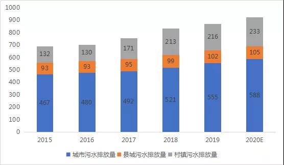 污水排放量持續(xù)上升,污水處理能力亟待增強(qiáng)。除了供水外,污水處理也是目前水務(wù)行業(yè)重點(diǎn)關(guān)注的領(lǐng)域之一。從污水處理的供給來(lái)看,由于城鎮(zhèn)化和經(jīng)濟(jì)發(fā)展需求,我國(guó)城市近年來(lái)污水產(chǎn)生量和處理量呈上升趨勢(shì)。截至2019年底,全國(guó)城市污水排放量為555億噸,縣城污水排放量為102億噸,村鎮(zhèn)污水排放量為216億噸,合計(jì)873億噸。據(jù)預(yù)測(cè),我國(guó)2020年城市污水排放量為588億噸,縣城污水排放量為105億噸,村鎮(zhèn)污水排放量為233億噸,合計(jì)926億噸。我國(guó)城鎮(zhèn)污水處理能力亟待增強(qiáng)。