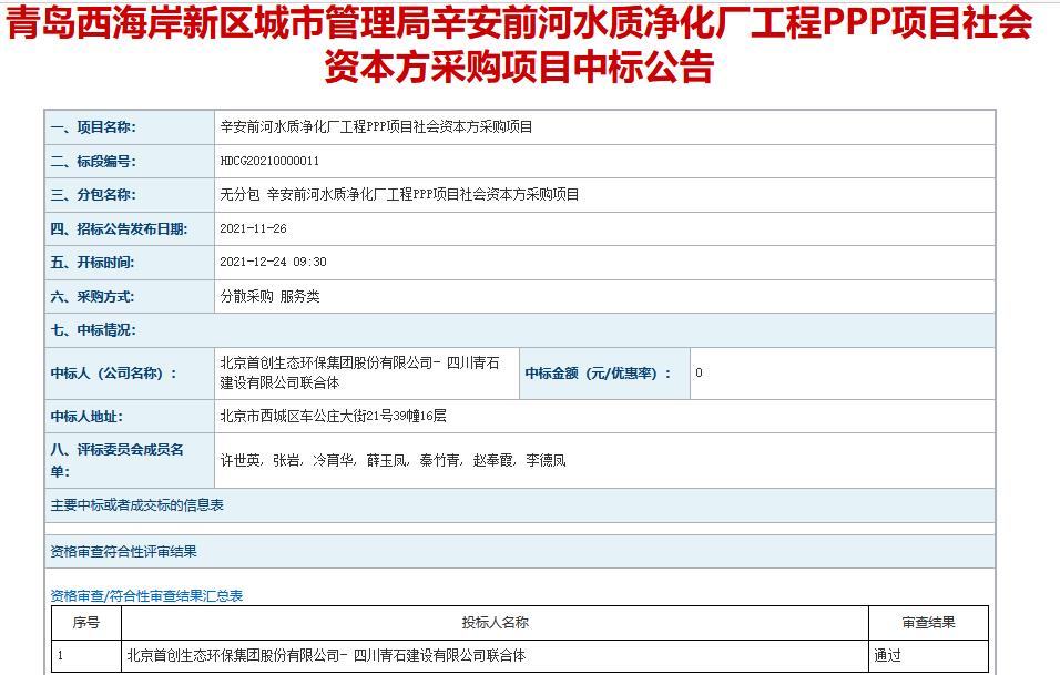 1月17日,青島市公共資源交易電子服務系統(tǒng)發(fā)布了青島西海岸新區(qū)城市管理局辛安前河水質(zhì)凈化廠工程ppp項目社會資本方采購項目中標公告,中標供應商為北京首創(chuàng)生態(tài)環(huán)保集團股份有限公司- 四川青石建設有限公司聯(lián)合體。