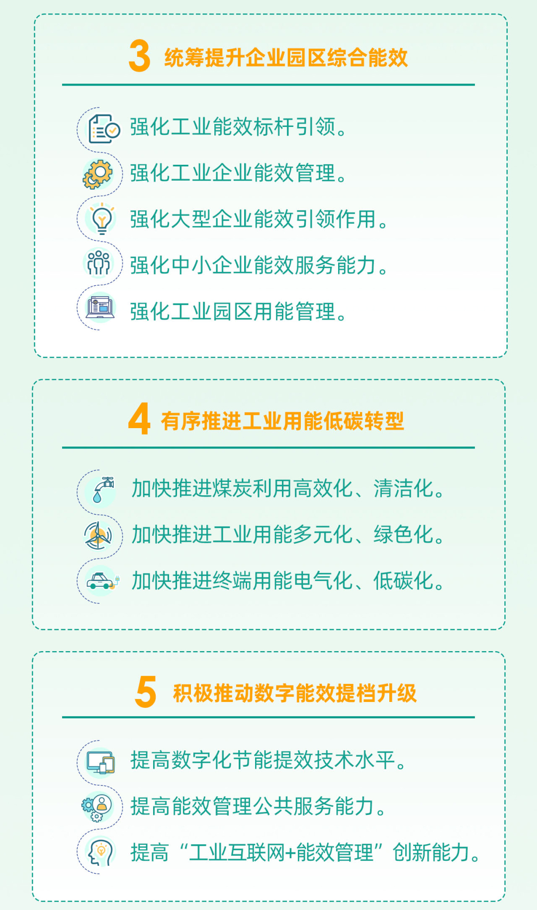 《行動(dòng)計(jì)劃》聚焦重點(diǎn)用能行業(yè)、重點(diǎn)用能領(lǐng)域和重點(diǎn)用能設(shè)備,分業(yè)施策,分類推進(jìn),系統(tǒng)提升工業(yè)能效水平;加強(qiáng)全鏈條、全維度、全過程用能管理,強(qiáng)化標(biāo)準(zhǔn)引領(lǐng)和節(jié)能服務(wù),協(xié)同提升大中小企業(yè)、工業(yè)園區(qū)能效水平;統(tǒng)籌優(yōu)化工業(yè)用能結(jié)構(gòu)、數(shù)字賦能等對節(jié)能提效的促進(jìn)作用,全面提升工業(yè)能效基礎(chǔ)。具體提出7個(gè)方面任務(wù):