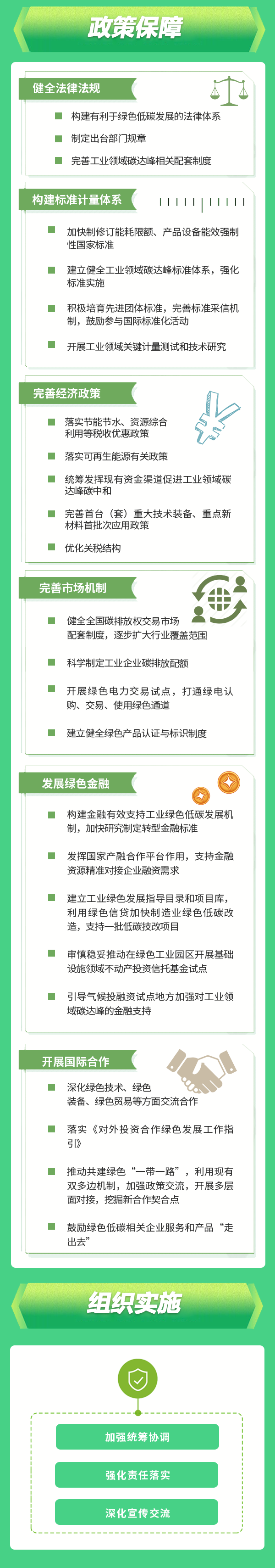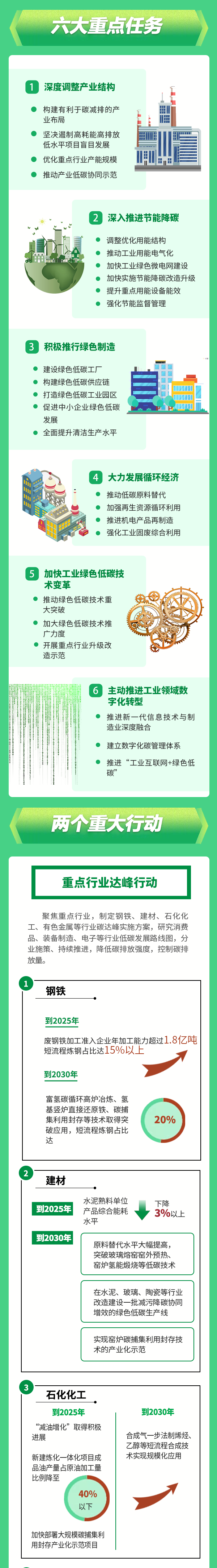 工業(yè)和信息化部、國家發(fā)展改革委、生態(tài)環(huán)境部印發(fā)《工業(yè)領(lǐng)域碳達峰實施方案》(以下簡稱《方案》),其中提出,“十四五”期間,產(chǎn)業(yè)結(jié)構(gòu)與用能結(jié)構(gòu)優(yōu)化取得積極進展,能源資源利用效率大幅提升,建成一批綠色工廠和綠色工業(yè)園區(qū),研發(fā)、示范、推廣一批減排效果顯著的低碳零碳負碳技術(shù)工藝裝備產(chǎn)品,筑牢工業(yè)領(lǐng)域碳達峰基礎(chǔ)。